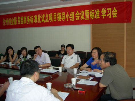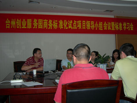 在加强省级服务业标准化试点项目建设的管理,提升我省服务业标准化整体发展水平,促进我省经济转型升级的大环境下,7月17日,为实施好台州创业服务园商务标准化试点项目,由台州市开发区主任王丹主持,召开了创业服务园商务标准化试点项目工作领导小组会议暨标准化试点项目培训.会议主要内容是部署创业服务园商务标准化试点项目工作任务;贯彻《浙江省级服务业标准化试点项目管理办法》(试行);讲解《浙江省服务业标准化试点项目验收评价细则》;标准化理论学习等.