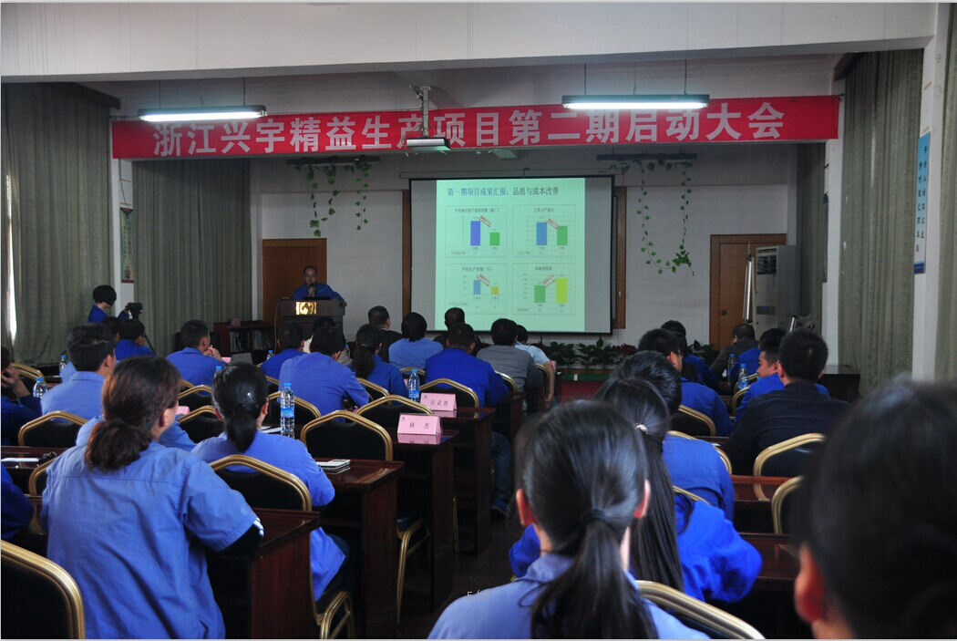 浙江兴宇汽车零部件有限公司第二期精益生产项目启动大会于2014年10月16日在兴宇老厂四楼会议室召开,公司领导陈文杰、朱小平及各部门负责人车间员工代表70余人参加了本次会议.