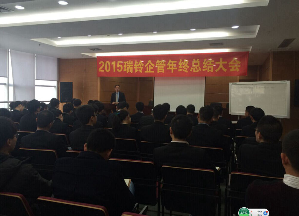 本次年终总结大会回顾了15年瑞铃重大事件,分析了大环境不景气情况下,瑞铃企管面临的机遇和挑战,提出了向价值链高端延伸、专业化经营的思路,彰显出力求创新、专业并专注的发展之路.以现有三大业务板块为平台,秉承团队、创新、敬业、诚信经营理念,辅助中国民营制造业转型升级,成为被各方高度认可的创新型企业.会议明确了2016年十字经营方针(安全性、可持续性和吸引力),提出了16年经营目标.